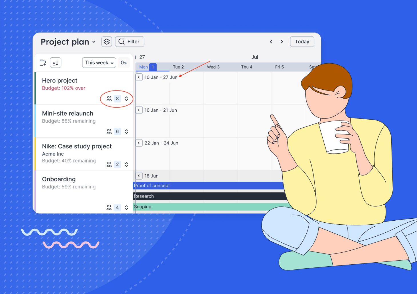 Get a quicker view of what you need to know when planning work鈥攚ith total people and start and end dates added to the Project Plan. See how many people are on each project and click the project dates to jump forward or back to that point point in time. Voila! It's more info in fewer clicks 鉁